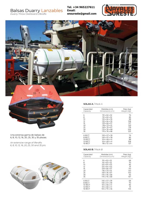 Balsa salvavidas Duarry Solas en contenedor cilíndrico o rectangular homologadas de acuerdo a SOLAS 74 Capitulo III y enmiendas y conforme a la Directiva Europea de Equipos Marinos.
