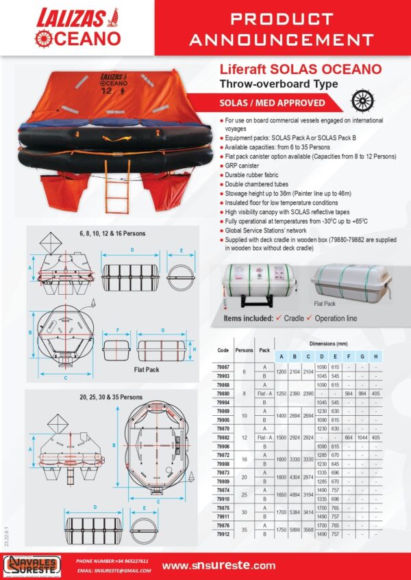Balsa salvavidas Lalizas Solas en contenedor cilíndrico (6, 8, 10 y 12 plazas) y contenedor rectangular (8 y 12 plazas), homologadas SOLAS/MED (Maritime Equipment Directive 96/98/EC ultimas enmiendas). Certificado como artículos A.1/1.12 Balsas Salvavidas y testados conforme a las normas aplicables, tal como menciona en la directiva MED, i.e. SOLAS 74. Fabricada en tejido duradero de goma natural, flotadores de doble camara con válvulas de seguridad y suelo aislante para condiciones de baja temperatura. Totalmente operativa a temperaturas desde -300º hasta + 650º. Extensa red de más de 200 estaciones de servicio en todo el mundo.