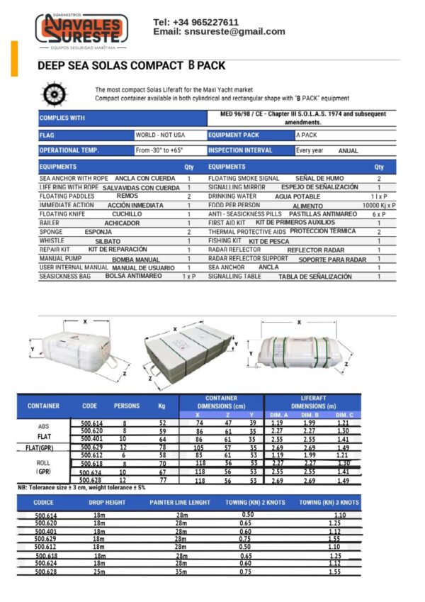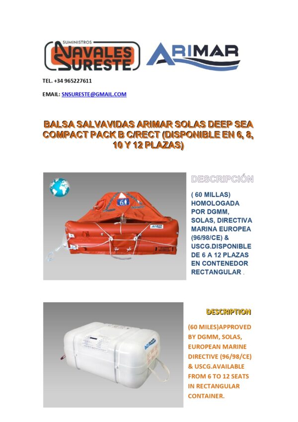 Balsa salvavidas ARIMAR 6 PLAZAS SOLAS DEEP SEA COMPACT PACK B ( 60 MILLAS )