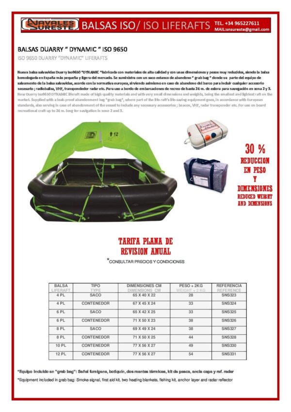 Nueva balsa salvavidas Duarry Iso9650 “DYNAMIC “ fabricada con materiales de alta calidad y con unas dimensiones y pesos muy reducidos, siendo la balsa homologada en España mas pequeña y ligera del mercado. Se suministra con un saco estanco de abandono “ grab bag “ donde va parte del equipo de salvamento de la balsa salvavidas, acorde con la normativa europea, sirviendo asimismo en caso de abandono del barco para incluir cualquier accesorio necesario ; radiobaliza, VHF, transpondedor radar etc.