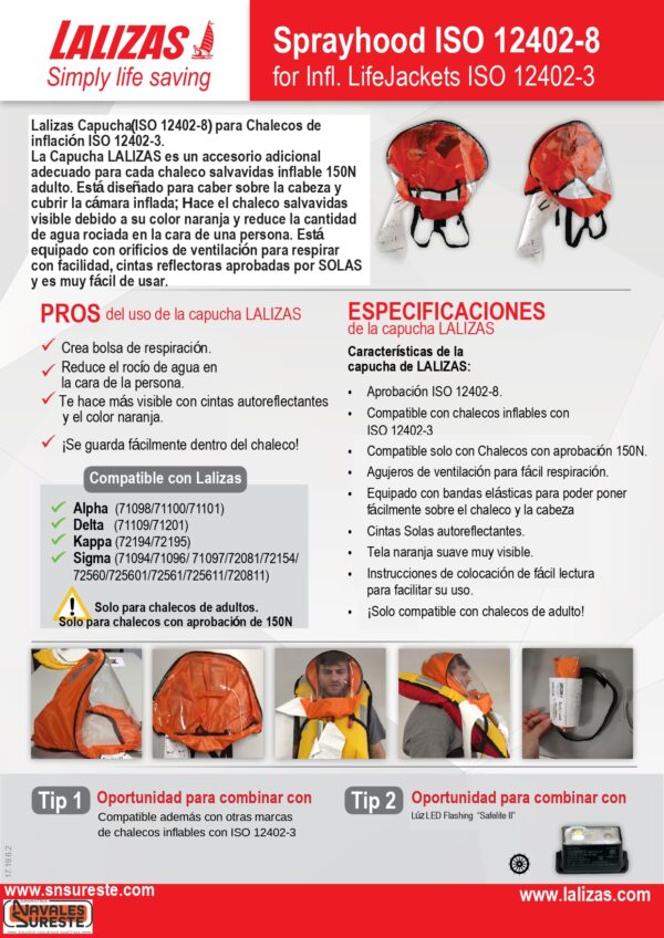 PINCHE https://www.snsureste.com/wp-content/uploads/2019/11/CAPUCHA-LALIZAS-_-ESP.pdf AQUÍ PARA DESCARGAR CARACTERÍSTICAS.Designed to fit over the head and cover the inflated chamber, it makes the life jacket more visible due to its orange color and reduces the amount of water sprayed on a person’s face. It is equipped with ventilation holes and Solas reflective tapes.