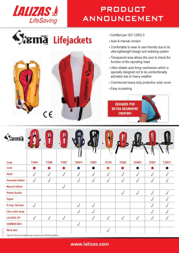 El chaleco salvavidas Sigma es de diseño ultra ligero y su correaje cómodo lo hacen fácil de llevar puesto, con una ventana transparente para poder ver el estado del disparador. Consta de una cámara que puede ser inflada mediante válvula de acción manual ( ISO 12402-7 ) o por disparo automático lalizas ( ISO 12402-7 ), además de un tubo de inflación oral ( ISO 12402-7 ). esta cámara inflable de tejido amarillo de alta visibilidad se pliega dentro de un forro exterior de nilon de color rojo cerrado con velcro. Equipado con cinta reflectante, silbato y asa para facilitar el salvamento. Homologado CE ISO 12402-3.