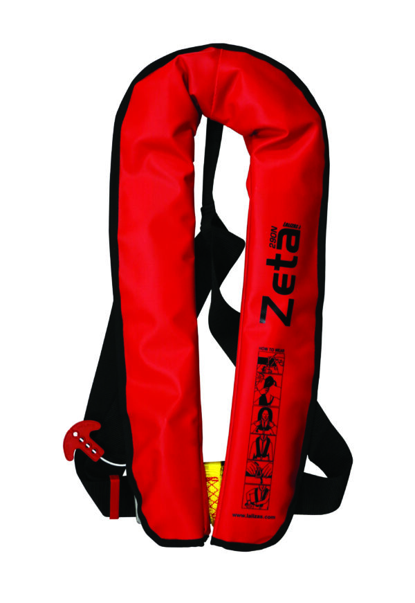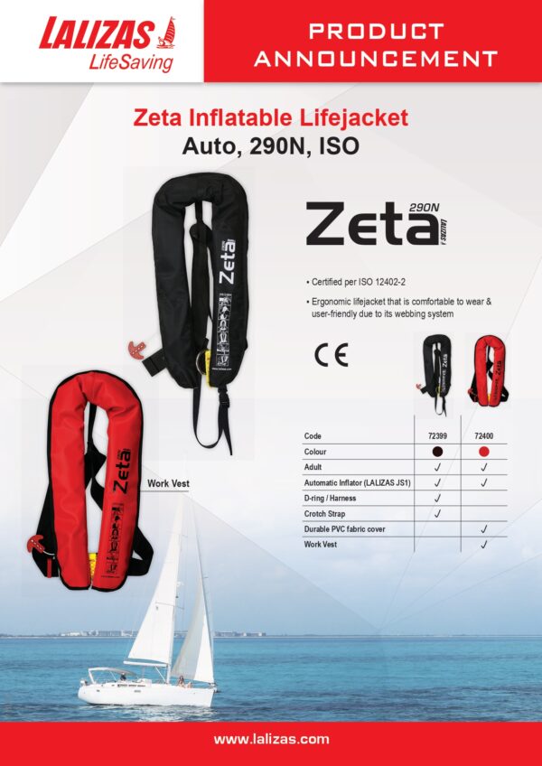 el chaleco hinchable Zeta es un chaleco ergonómico , cómodo de llevar y fácil de usar.. se caracteriza por una cámara que puede ser inflada a través del disparador automático Lalizas y un tubo de inflado oral. la cámara de inflado es de color amarillo de alta visibilidad y esta equipado con cintas reflectantes y silbato.