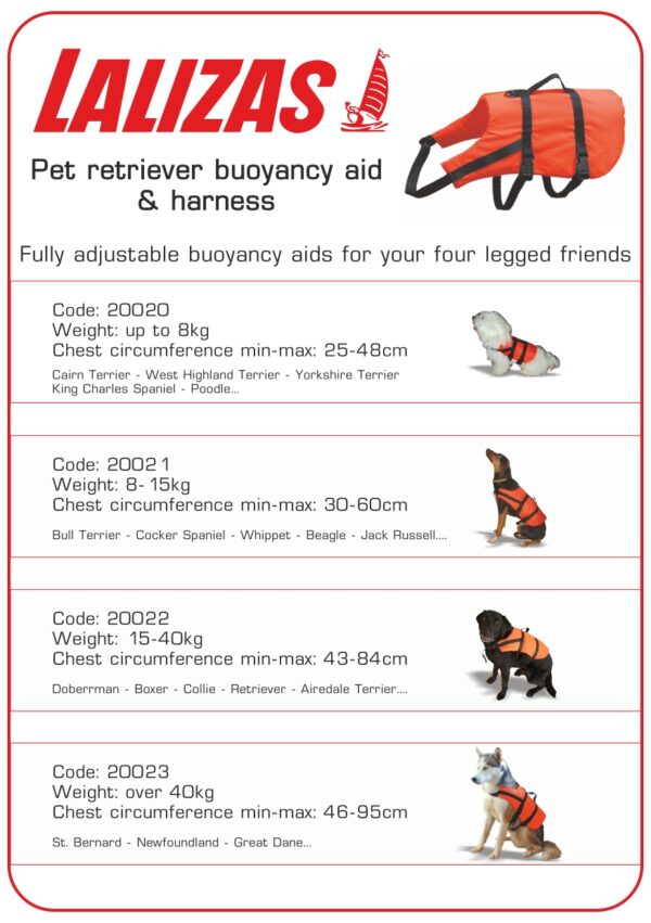 Chaleco diseñado para la seguridad de los animales de compañía a bordo. Fabricado en espuma y con correaje de sujeción fuerte y asa de rescate.