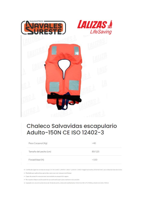 CHALECO SALVAVIDAS ESCAPULARIO 150 N ADULTO LALIZAS