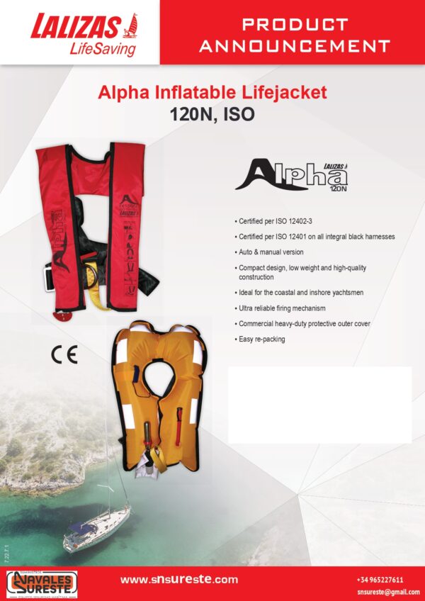 El chaleco salvavidas Alpha posee un diseño compacto, bajo peso y alta calidad, consta de una cámara que puede ser inflado mediante válvula de acción manual (ISO 12402-7), además de un tubo de inflación oral (ISO 12402-7). Esta cámara inflable de tejido amarillo de alta visibilidad se pliega dentro de un forro exterior de nilón de color rojo. Equipado con cinta reflectante, silbato y asa para facilitar el salvamento. Homologado CE ISO 12402-3.