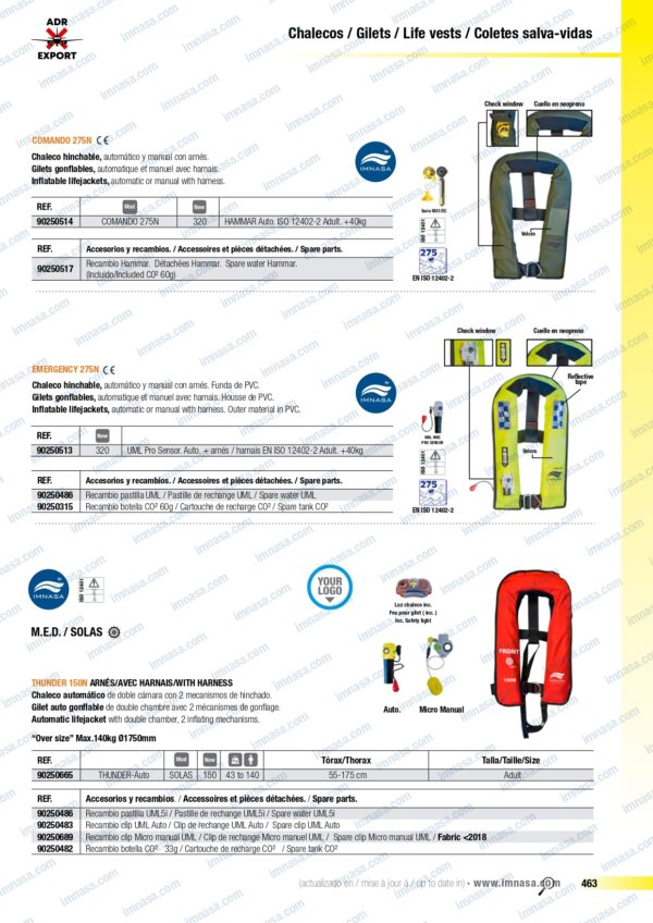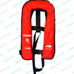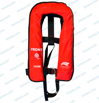 Chaleco salvavidas homologado solas con arnés incorporado, flotabilidad 150 N. Doble cámara y dos mecanismos de hinchado .Single homologated lifejacket with built-in harness, 150 N buoyancy. Double chamber and two inflation mechanisms.