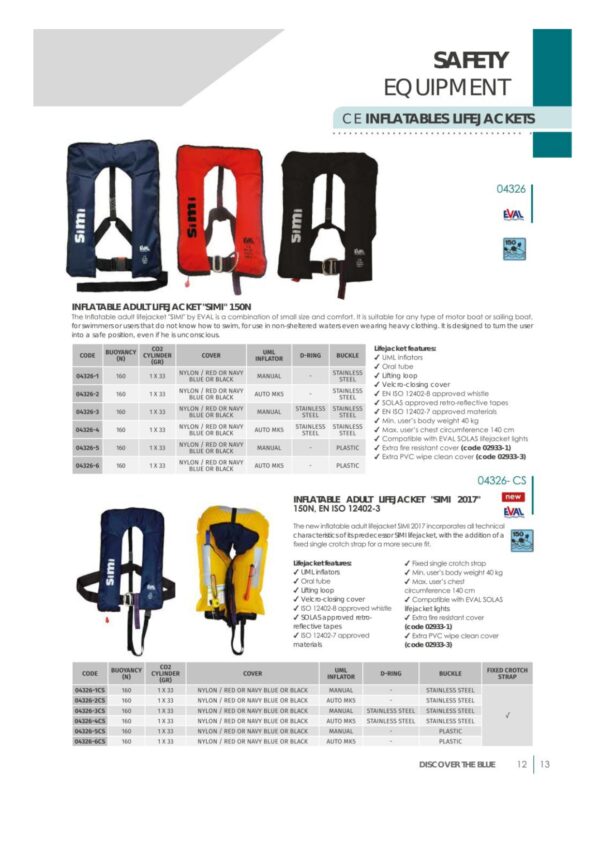 Cumple con todos los requisitos del mercado y la normativa europea de acuerdo con la norma EN ISO12402-3 / 150N. Ofrece una mayor flotabilidad de 165N . La cámara inflable está hecha de tela de color amarillo distintivo y doblada en una cubierta de nylon adecuado que se cierra con velcro, aprobado el silbato EN ISO 12402-8, boca y bucle/ correa de rescate. Está equipado con cinta retrorreflectante homologada SOLAS y materiales homologados EN ISO 12402-7. El mecanismo de activación UML para inflar el chaleco salvavidas es de gran sensibilidad y precisión , es compatible con la mayoría de los cilindros de CO2 de 33 gr del mercado.