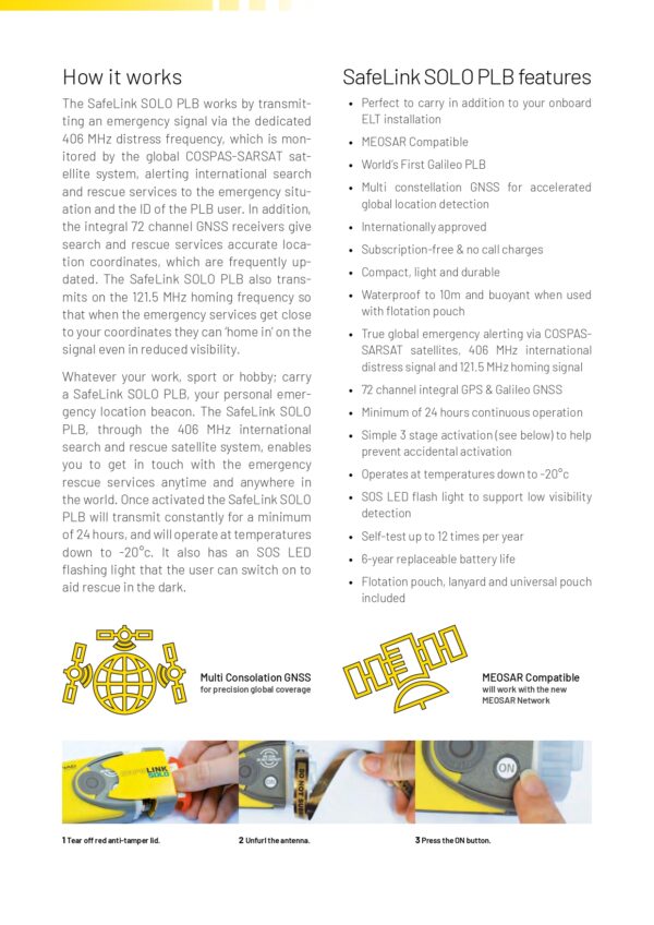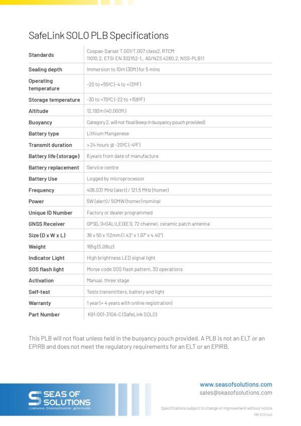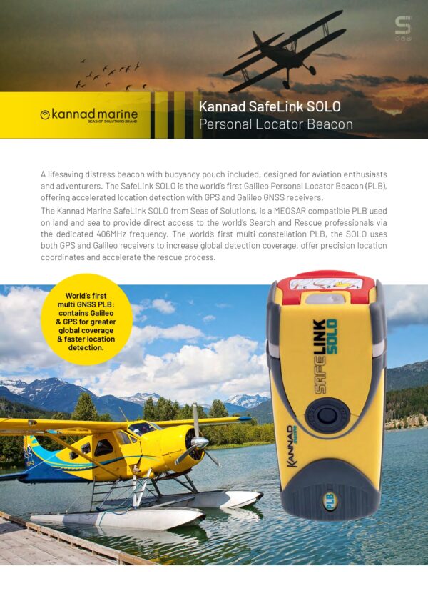 La radiobaliza personal KANNAD SAFELINK SOLO es una radiobaliza personal muy compacta que funciona a través del sistema satelital COSPAS-SARSAT en la frecuencia de 406 MHz y se puede usar en cualquier ambiente, tanto marino, terrestre o aéreo.