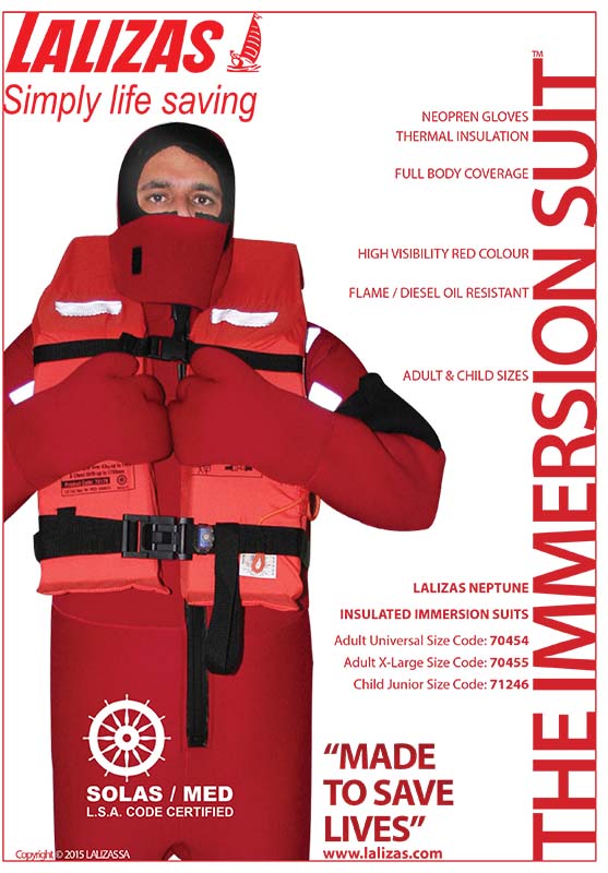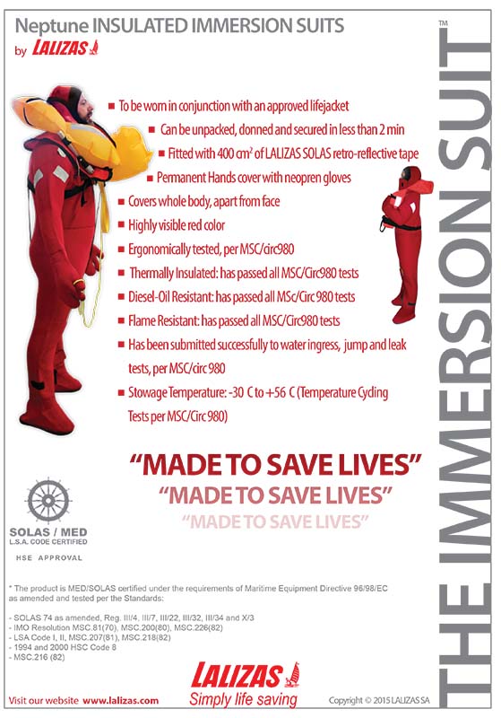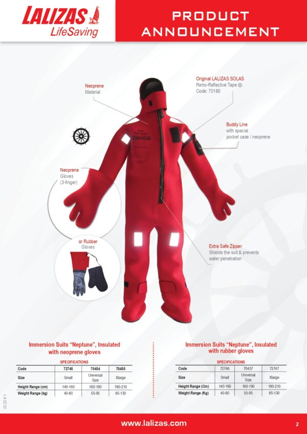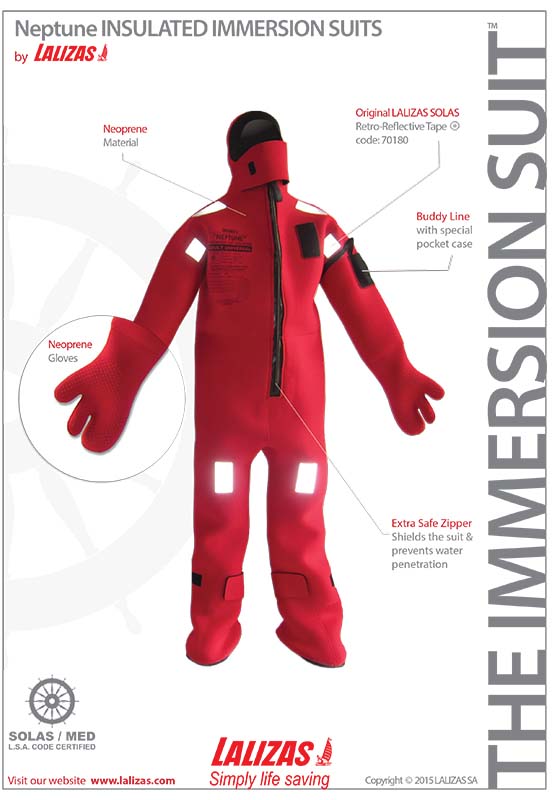 El traje de inmersión Neptune le mantendrá seco, manteniendo el calor corporal y reduciendo el peligro de hipotermia. Fabricado en neopreno reforzado, con sello de cara, guantes de tres dedos, cremallera frontal impermeable, bolsillo y cintas reflectantes. homologación Solas.