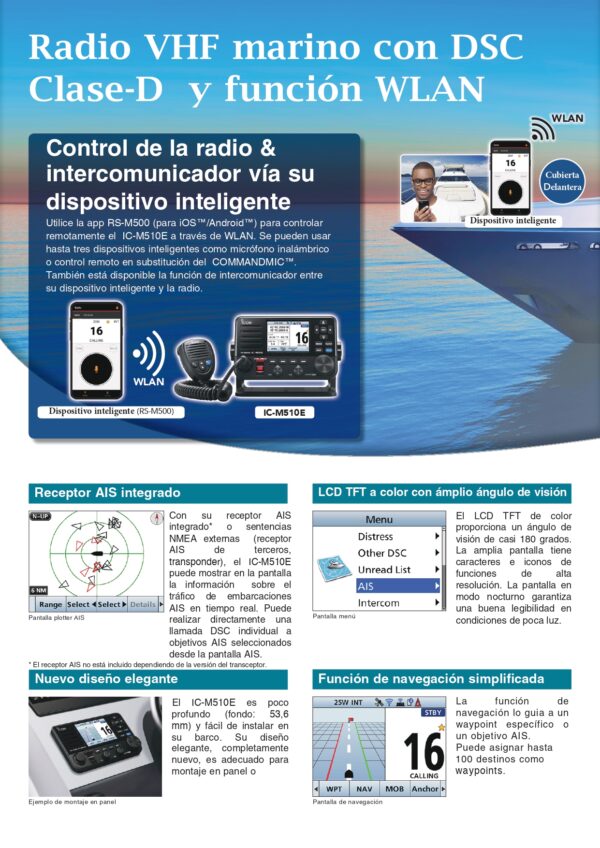 ICOM IC-M510E Emisora VHF DSC se puede descargar una APP gratuita en el movil para convertirlo en una segunda estación de la radio. Tambien se pueden realizar comunicaciones internas entre el móvil y el VHF.. La emisora ICOM IC-M510E Emisora VHF DSC con llamada selectiva digital DS, LCD TFT a color con un amplio ángulo de visión, diseño elegante entre muchas otras características. El ICOM IC-M510 admite además una segunda estación tradicional por cable. El IC-M510 tiene NMEA200 y NMEA0183, ademas de Megafonía, pero es necesario utilizar el interface CT-M500, que se conecta con el IC-M510 por Wifi.