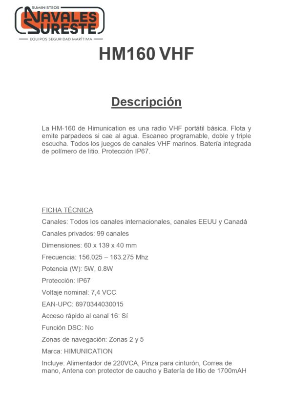 La HM-160 de Himunication es una radio VHF portátil básica. Flota y emite parpadeos si cae al agua. Escaneo programable, doble y triple escucha. Todos los juegos de canales VHF marinos. Batería integrada de polímero de litio. Protección IP67.