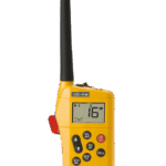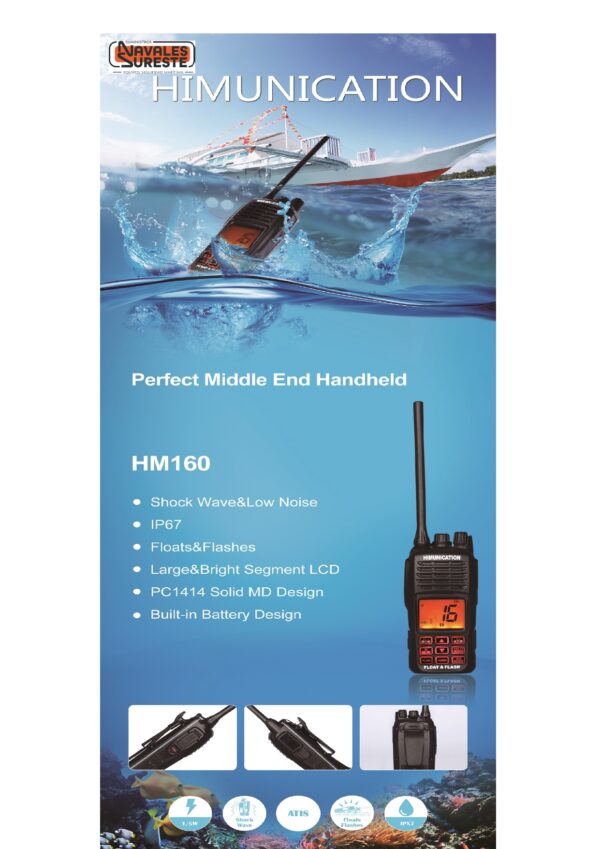 Himunication HM-160 is a basic portable VHF radio. It floats and blinks if it falls into the water. Programmable scan, double and triple watch. All marine VHF channel sets. Built-in lithium polymer battery. IP67 protection.