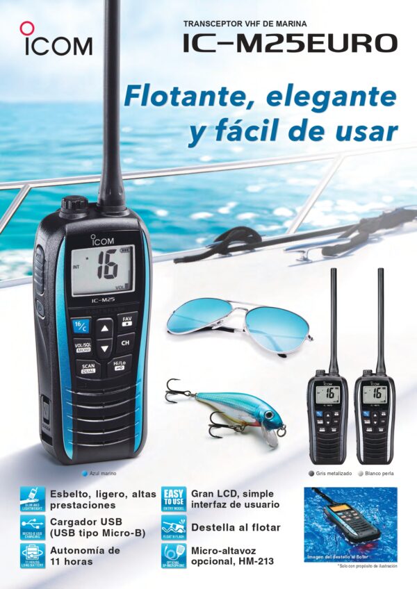 PRECIO VALIDO UNICAMENTE PARA TIENDA ONLINELow size and high performance portable radio telephone, selectable power 1 or 5 W, frequency from 156.025 to 163.275 MHz, simplex and duplex, 54 channels, all international channels, double or triple watch (channel 16 + 1, or 2 channels), waterproof IPX6, floating, immersion FLASHLLIGHT system, dimensions without antenna 126x52x33 mm. Weight 450 gr. Standard supply includes: 220 V battery charger, belt holder.