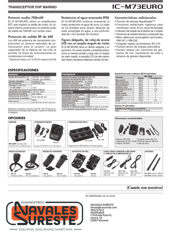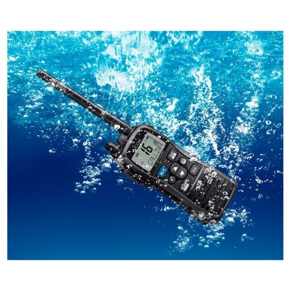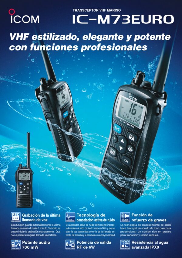 El Vhf Portátil ICOM IC-M73EURO nos ofrece la mejor protección contra el agua, le permite resistir estar sumergida en agua, a una profundidad de 1,5m durante 30 minutos.