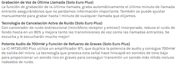 La IC-M73EURO Plus utiliza un amplificador BTL que duplica la potencia de audio y consigue 700mW