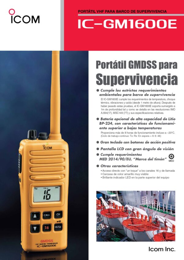 Icom IC-GM1600E VHF Portátil GMDSS SOLAS cumple los requerimientos de temperatura, choque térmico, vibraciones y caída (desde 1 metro de altura). Después de haber pasado estas pruebas, el IC-GM1600E soporta sumergido a 1m de profundidad tal y como se detalla en las resoluciones IMO A.809(19), A.694(17) y sus especificaciones relativas. Batería litio de repuesto BP234 con características de funcionamiento superior a bajas temperaturas.