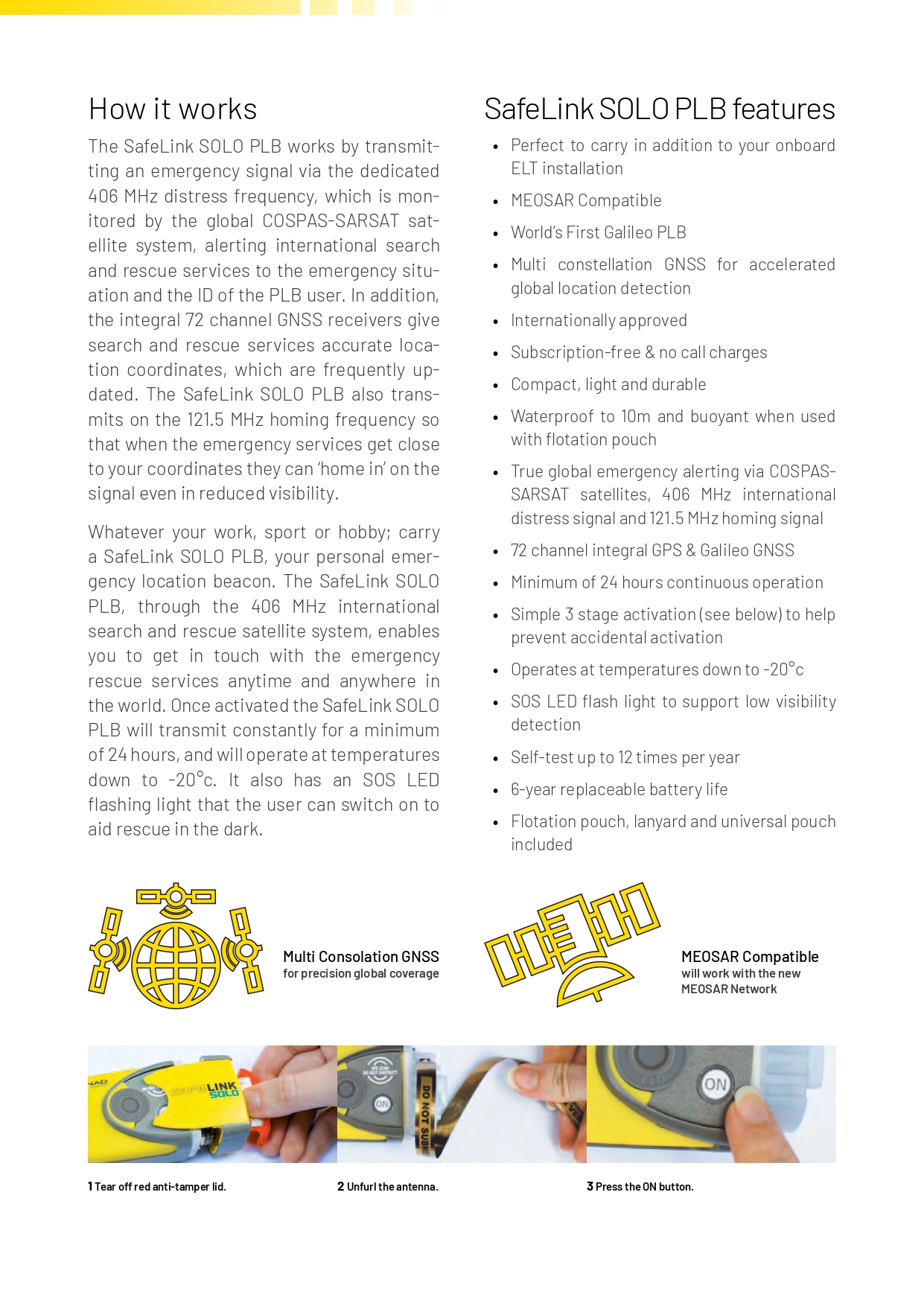 La radiobaliza personal KANNAD SAFELINK SOLO es una radiobaliza personal muy compacta que funciona a través del sistema satelital COSPAS-SARSAT en la frecuencia de 406 MHz y se puede usar en cualquier ambiente, tanto marino, terrestre o aéreo.